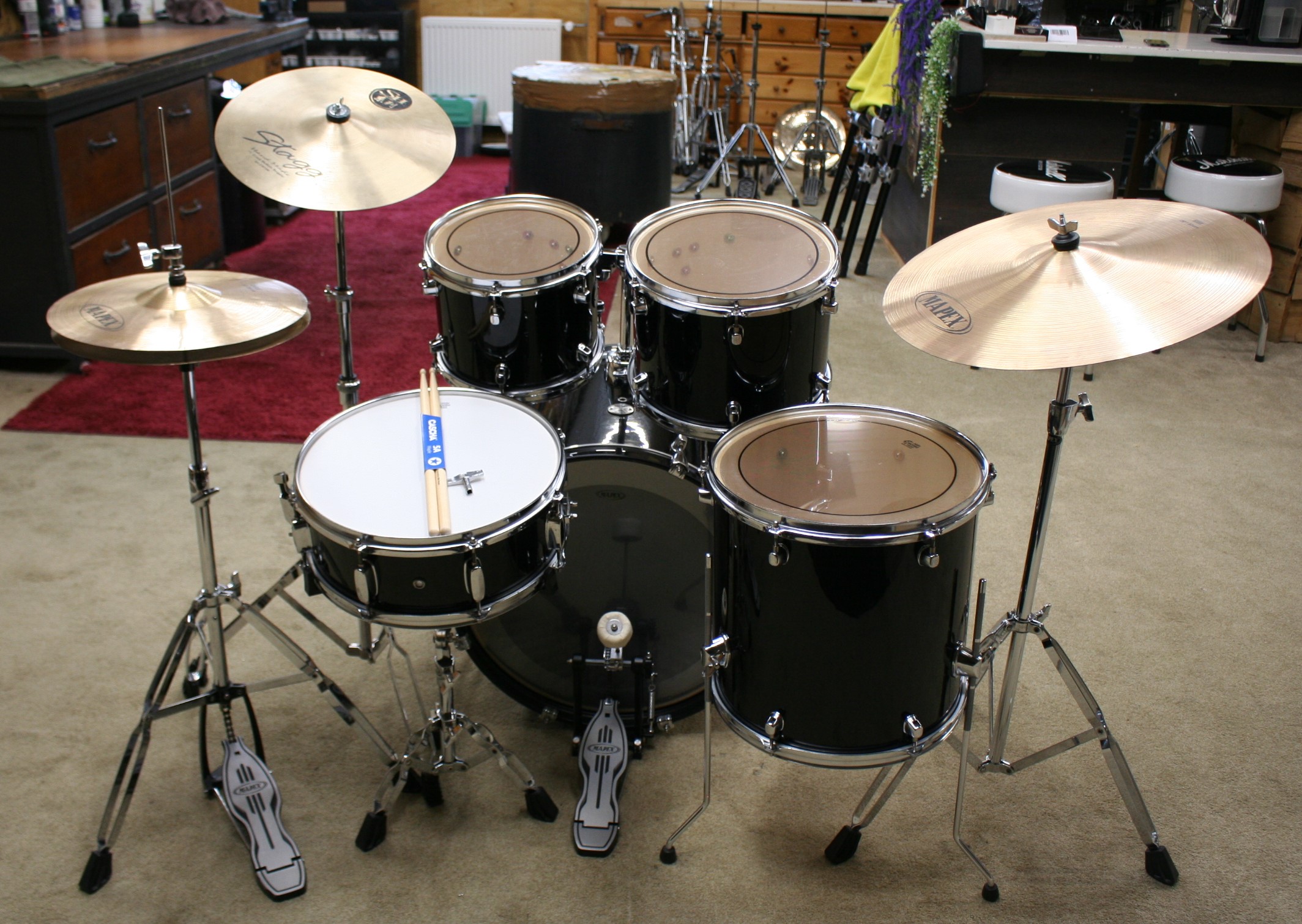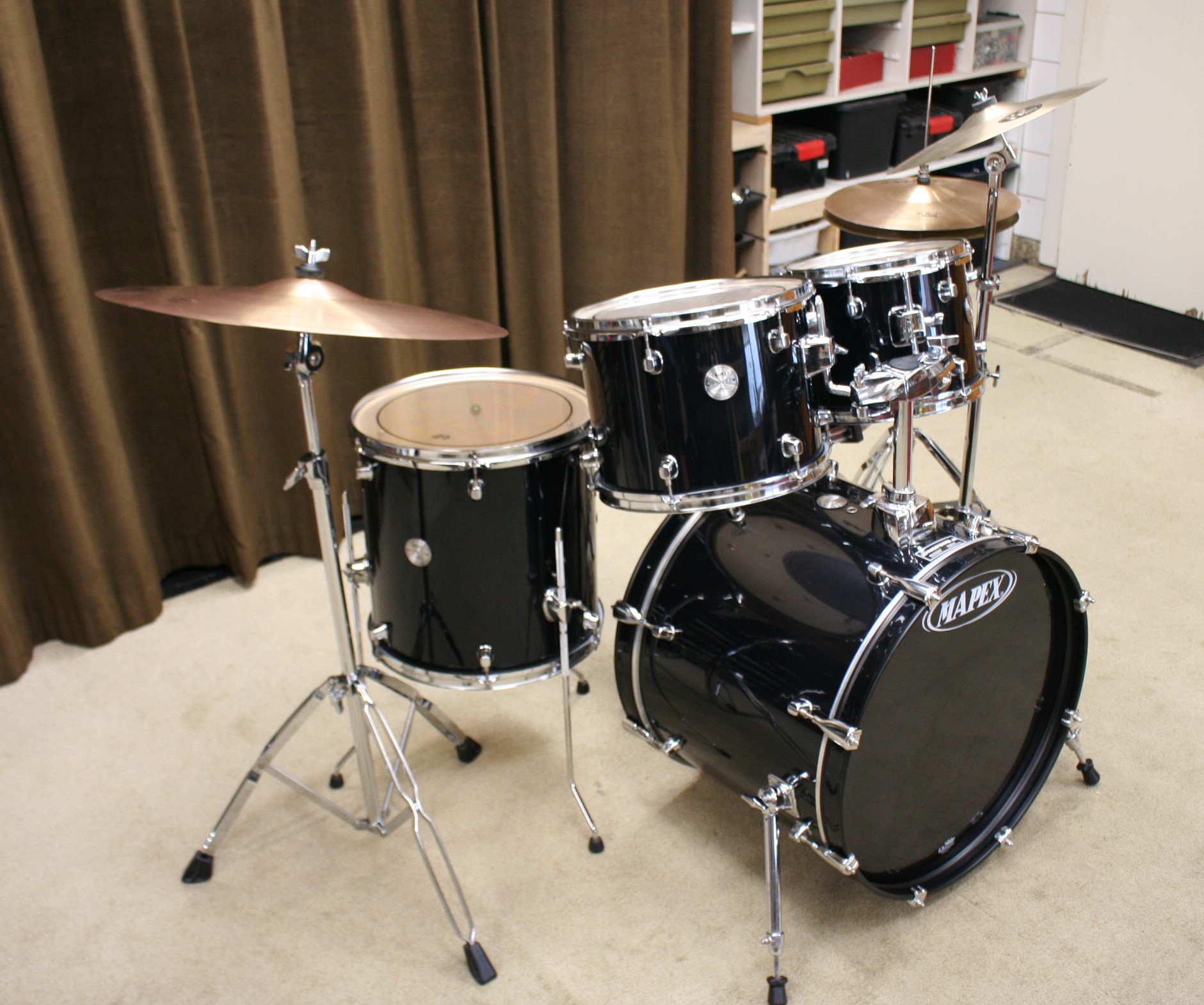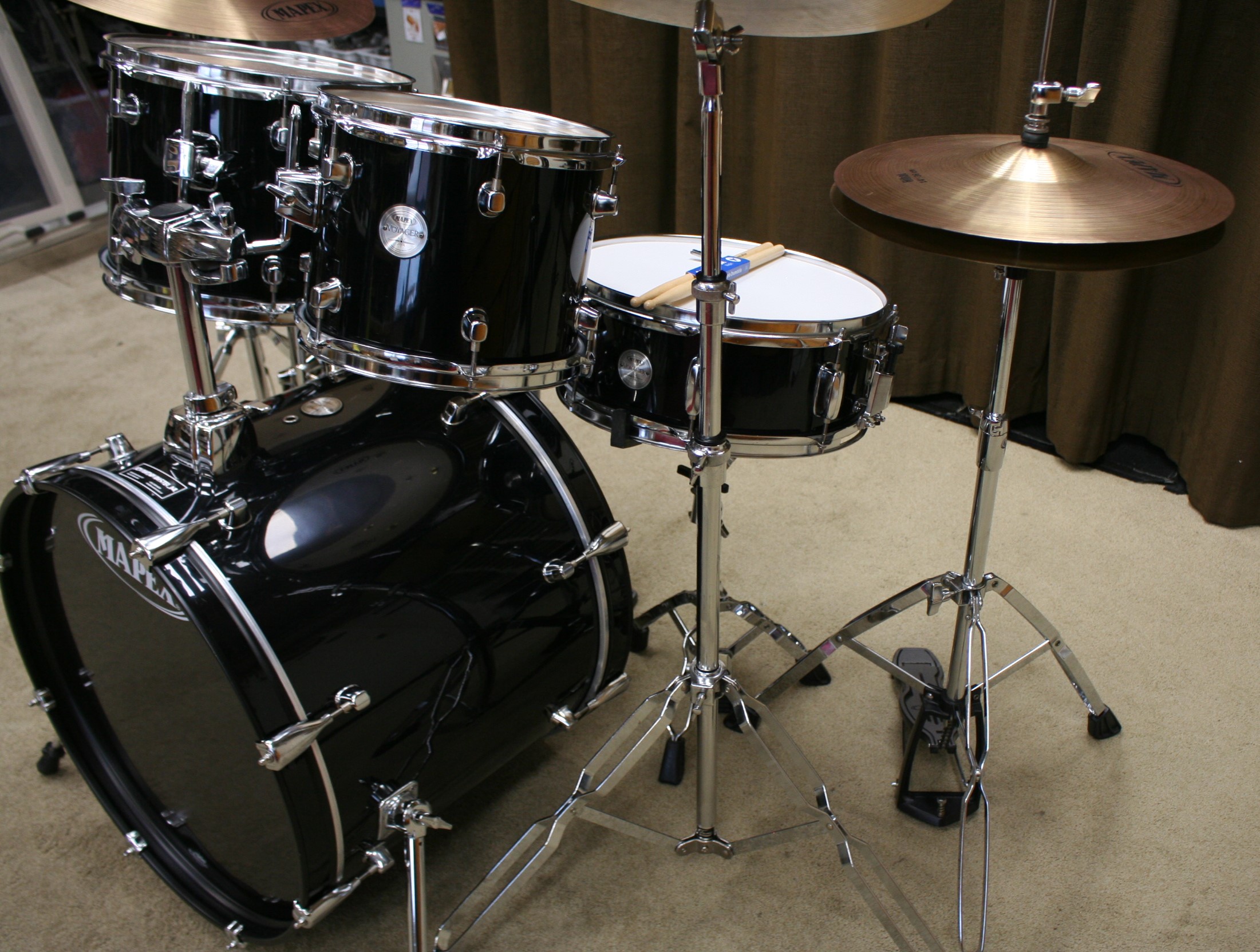 incl. bekkenset bestaande uit 14 inch hihat, 14 inch crash en 20 inch ride,